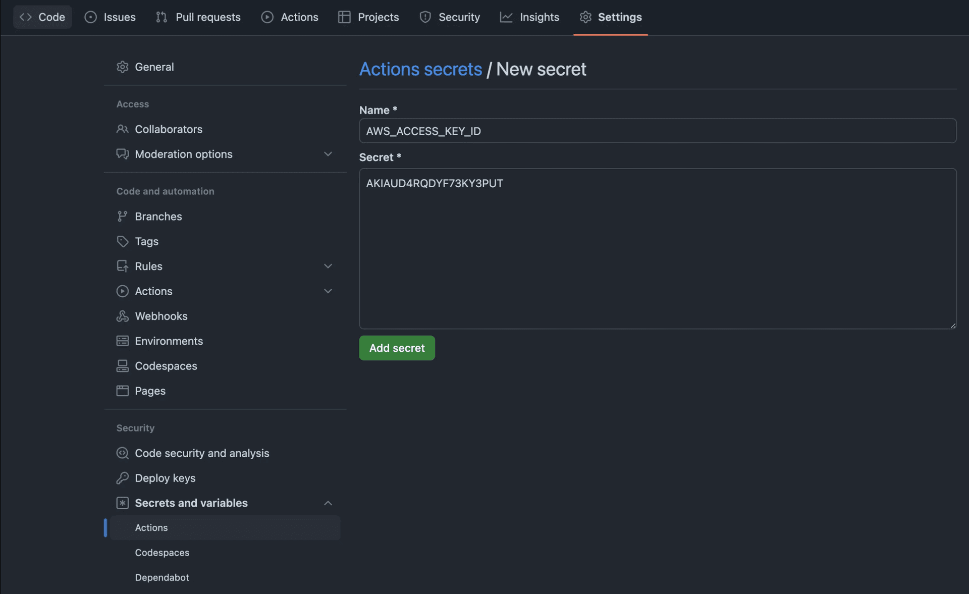 First, let's add all the required environment variables obtained in the AWS steps above to your GitHub repo as repository Secrets. Go to your GitHub repository's Settings, and click on Secrets and Variables. Then, click on New repository secret.